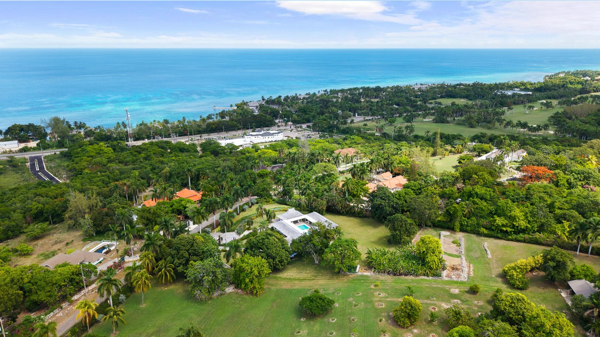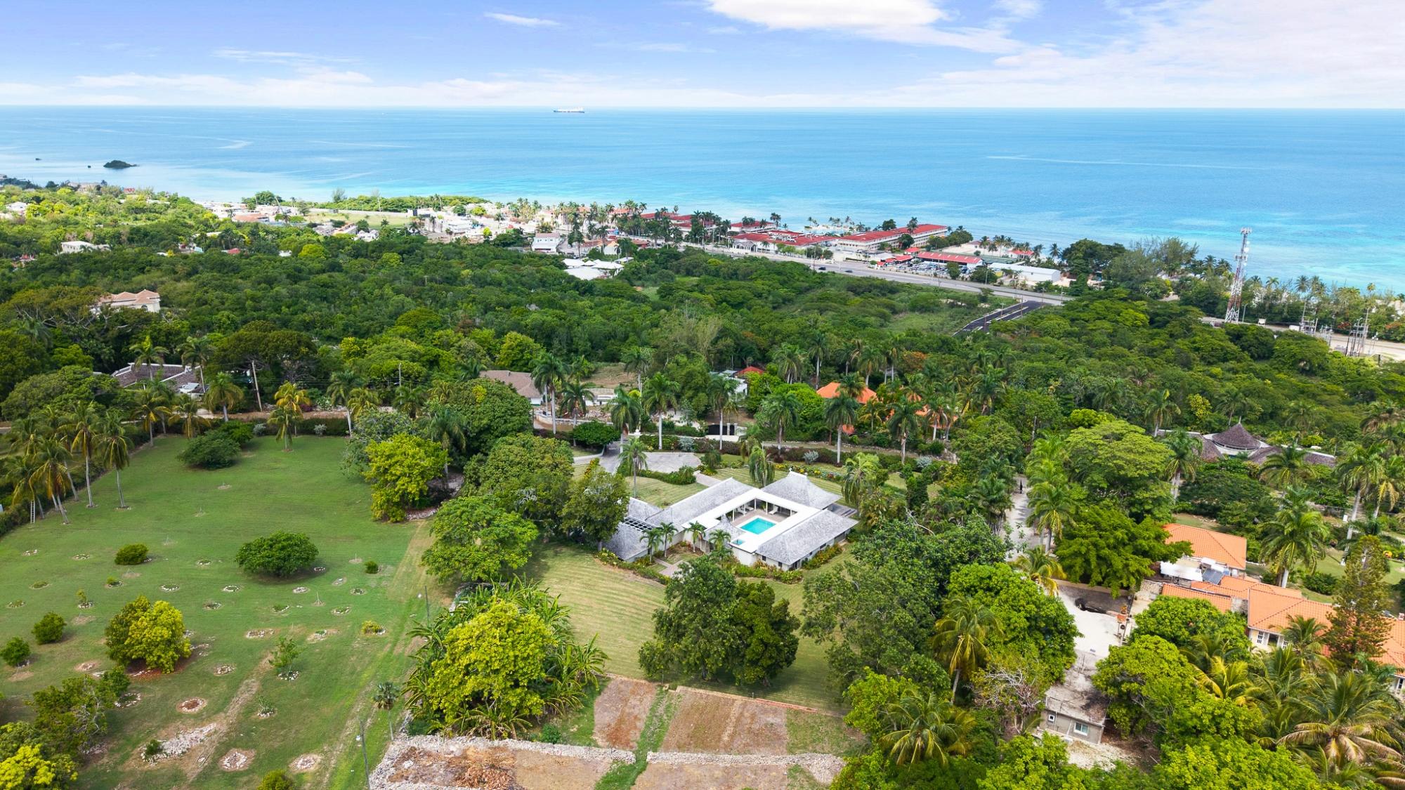 Located in the exclusive gated community of Spring Farm Estates, The Retreat offers luxury, privacy and space on one of the largest parcels in the neighbourhood. This stunning property spans four lots totaling approximately 6.7 acres, providing room for future expansion or development. The villa features a heated swimming pool, open and airy living spaces, manicured landscaping and a lush fruit garden overlooking the Caribbean Sea. Residents enjoy optional membership to Half Moon and Cinnamon Hill Golf Clubs, including access to their beaches and facilities. Conveniently situated just minutes from Hospiten private hospital, Donald Sangster International Airport, IAM Jet Centre, Doctor's Cave Beach, championship golf courses, dining, shopping and 5-Star resorts.